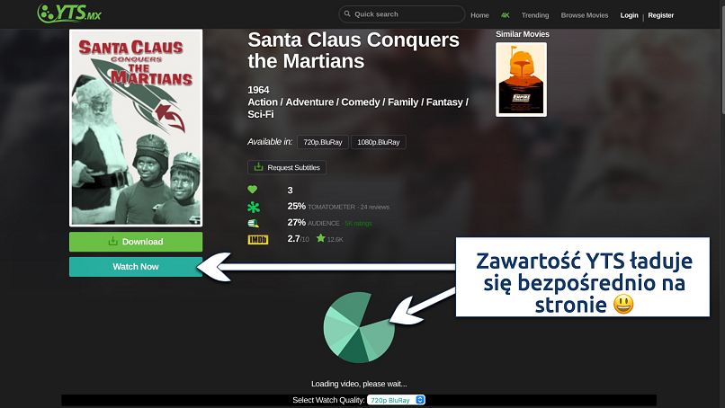 Jako że YTS specjalizuje się w filmach, nie znajdziesz tam innych typów treści takich jak muzyka, gry czy oprogramowanie, co mogłyby utrudnić wyszukiwania. Dostępne są także dane z IMDb i RottenTomatoes, dzięki czemu możesz dowiedzieć się, czy film przypadnie Ci do gustu zanim go pobierzesz.