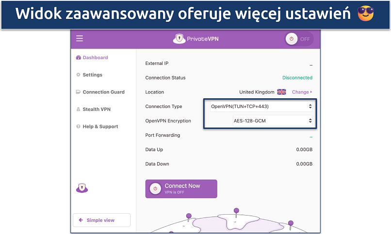 Konfigurowalne ustawienia zabezpieczeń PrivateVPN pozwalają zoptymalizować połączenie w Rosji. Możesz obniżyć szyfrowanie z AES 256-bit do 128-bit dla lepszych prędkości, jednocześnie zachowując bezpieczeństwo danych. Umożliwia także połączenia przez port 443, co pozwala wkomponować ruch VPN w regularny HTTPS, aby uniknąć wykrycia. Jeśli protokół zostanie zablokowany, można przełączyć na alternatywne, takie jak L2TP, które często działają lepiej w restrykcyjnych sieciach dzięki prostszemu szyfrowaniu.