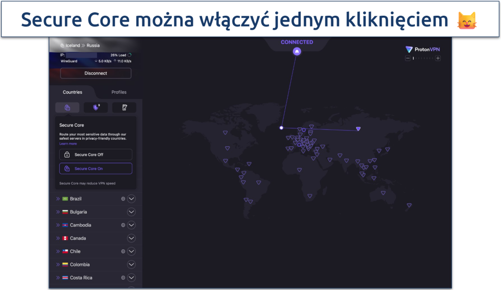 Secure Core Proton VPN poprawia bezpieczeństwo poprzez kierowanie ruchu przez zabezpieczone serwery w krajach przyjaznych prywatności. Dzięki temu znacznie trudniej rosyjskim władzom lub ISP (dostawcom usług internetowych) śledzić Twoją rzeczywistą lokalizację. Choć Secure Core może spowolnić prędkości bardziej niż zwykłe serwery, zapewnia mocniejszą prywatność i pozwala bezpiecznie korzystać z ulubionych stron, zarówno w Rosji, jak i poza nią.